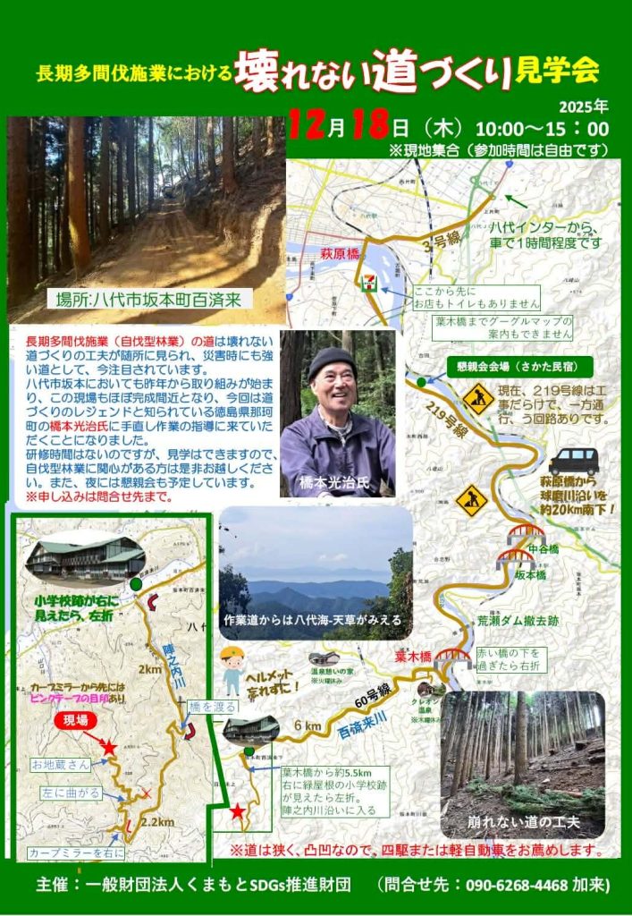 豊で災害に強い森づくりに取り組むKSPFは、現在自伐型のモデル林道づくりを進めています。今月18日に、自伐型林業のレジェンド橋本光治氏を招いて、八代市坂本町の現場において道づくりの見学会を行います。